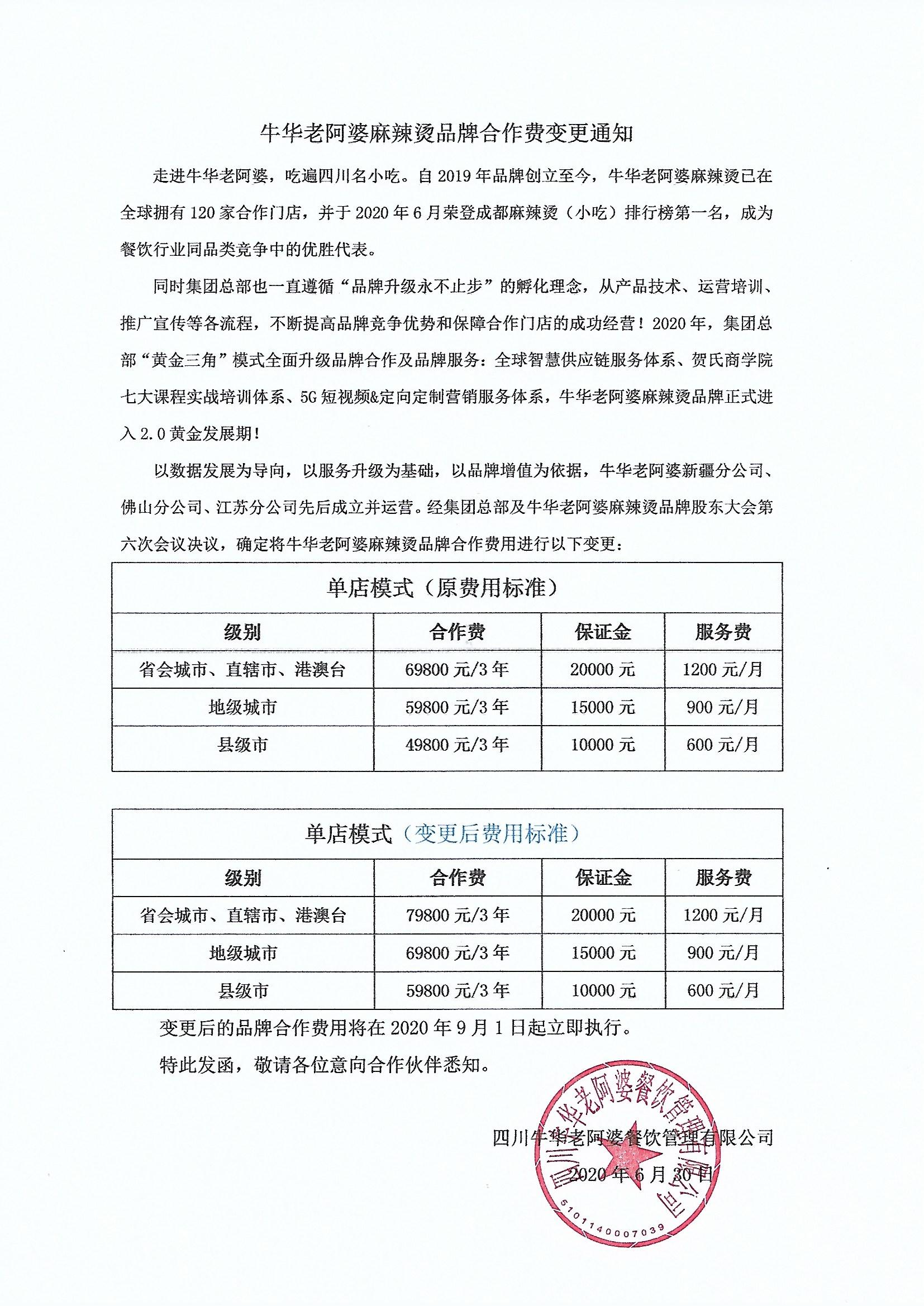集團(tuán)15號(hào)文件:牛華老阿婆麻辣燙品牌合作費(fèi)變更通知